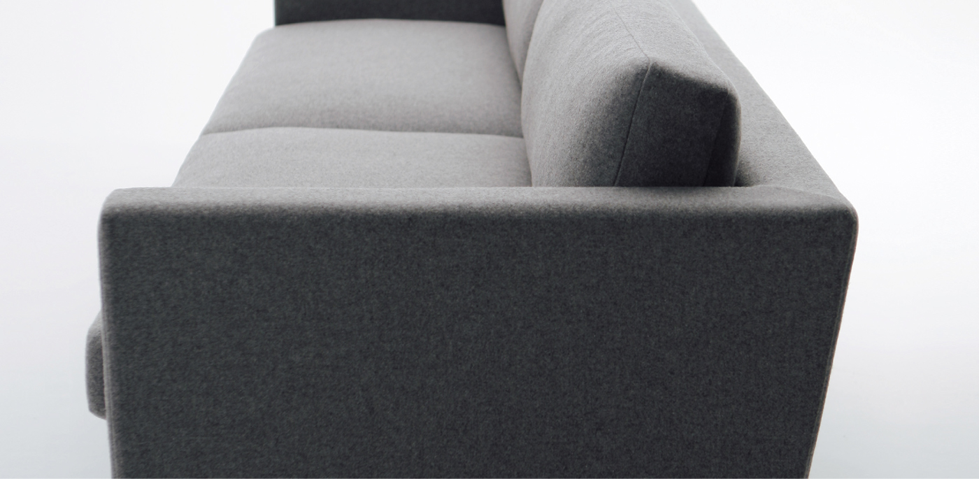 HIROSHIMAソファは、ローバックの水平ラインが印象的なデザインです。背もたれが低いため圧迫感がなく、モジュールシステムソファとして組み合わせても空間を大きく占有することはありません。その高さはHIROSHIMAアームチェアと同じ765mm。リビングからダイニングへと水平が美しく揃い、空間をより広く端正に見せてくれます。また、ソファのコーナーのフォルムにも気を遣っています。縫い合わせが盛り上がらないようにウレタンの形状に工夫を設けています。