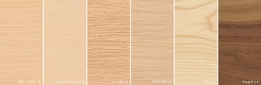 今回新たに加わったビーチ材です。きめ細かい木肌が美しい木材であるビーチに、スチームをかけることで全体的に少し赤みをおびた優しい色合いの木材です。スチームをかけることで一定の色味に揃え、木材を効率良く使用でき、流通量・価格が安定しています。アンスチームドビーチ: