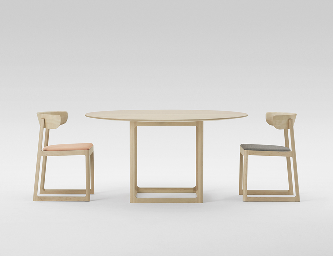 A round table gives rise to a certain atmosphere and a sense of ‘being together’ -simply by virtue of its circular shape. This, in a way, was my inspiration for working with a rounded atmosphere, using the embracing ‘klismos’ chair backrest and loop leg frames with chamfered details in a balanced soft-sharp appearance.