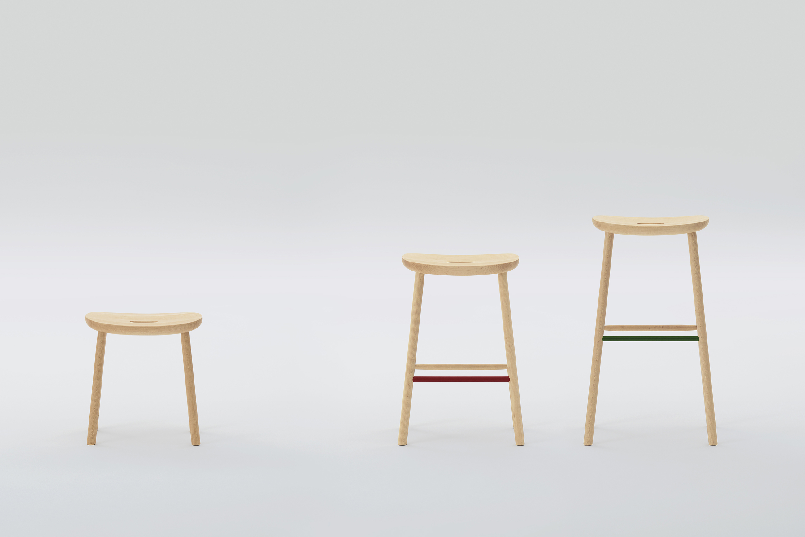 “O Stool is in 3d machined solid wood and the stool mid and high have painted steel tube footrests. The handle, consisting of an elongated hole machined through the centre of the seat is shaped for maximum comfort when carrying the stool. It is also a familiar typology revitalised with improved comfort and new materials.” -Jasper Morrison-