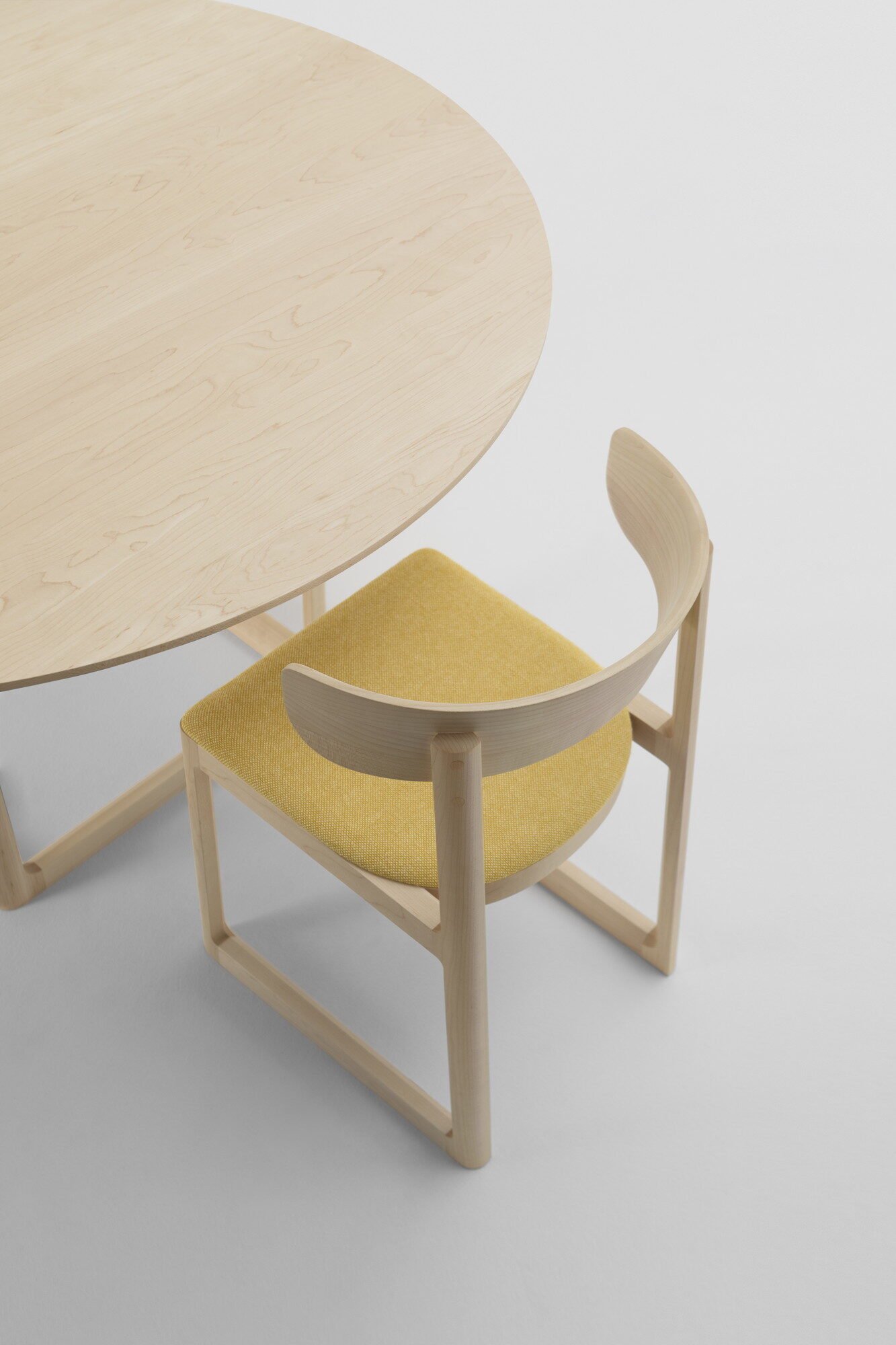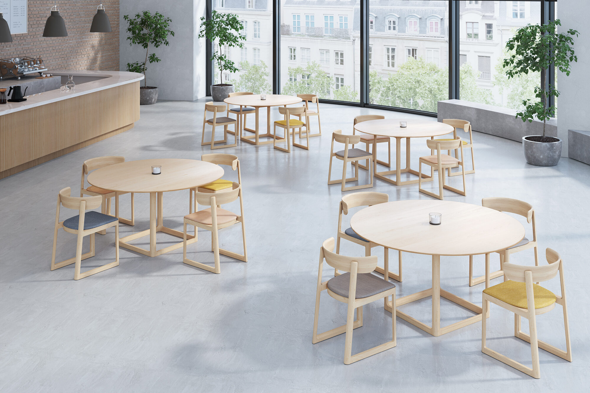 The chair with a roundish seat and a back with a gentle curve contrasting beautifully with the simple loop frame. The three-dimensionally carved curved backrest gently holding the back is impressive and equally serene. With the perfect blending of sharpness and softness, you feel the warmth of craftsmanship. The gentle atmosphere that this round table radiates spreads all over connecting people and space with its warmth.