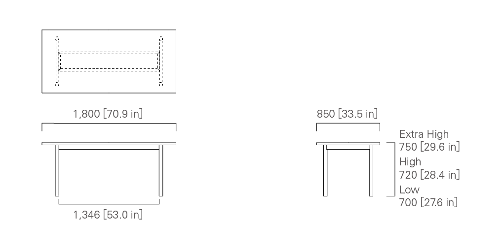 | Dimensions | Low: W1,800×D850×H700 (mm) High: W1,800×D850×H720 (mm) Extra High: W1,800×D850×H750 (mm) |