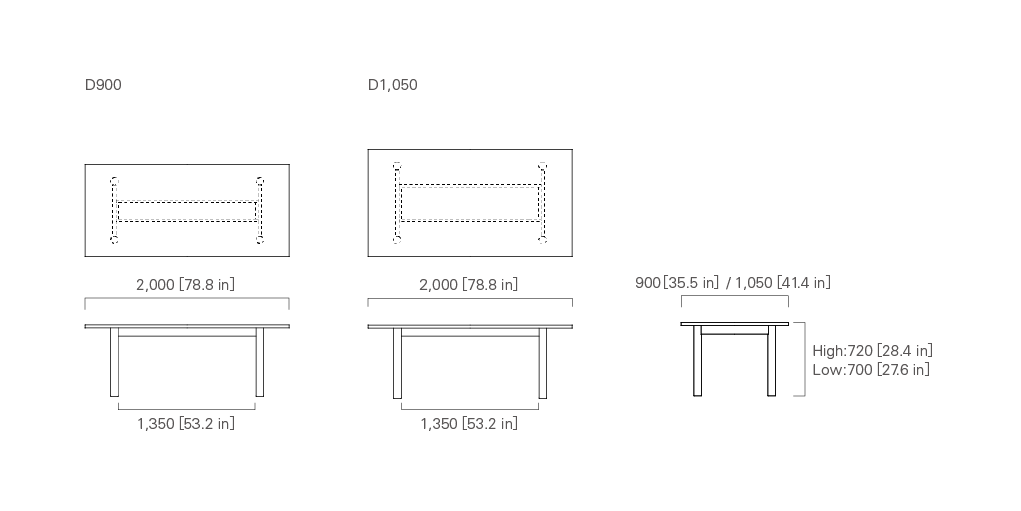 | Dimensions | D900-Low: W2,000×D900×H700 (mm) D900-High: W2,000×D900×H720 (mm) D1,050-Low: W2,000×D1,050×H700 (mm) D1,050-High: W2,000×D1,050×H720 (mm) |