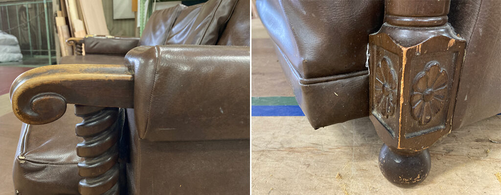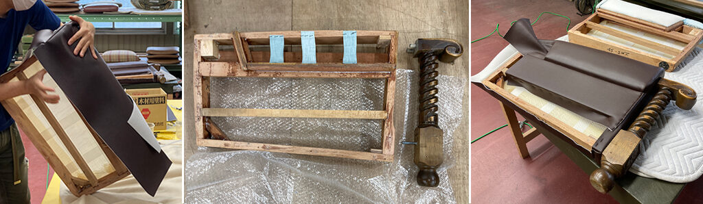 工場に入荷した際に工場スタッフより「せっかく張替えるのであれば、木部もきれいにするとグッと仕上がりの出来具合がよくなるよ」と提案があったため、お客様に相談したところ、「木部は良い感じで色が変化しているのでそのままにしてください」とのご返事でした。