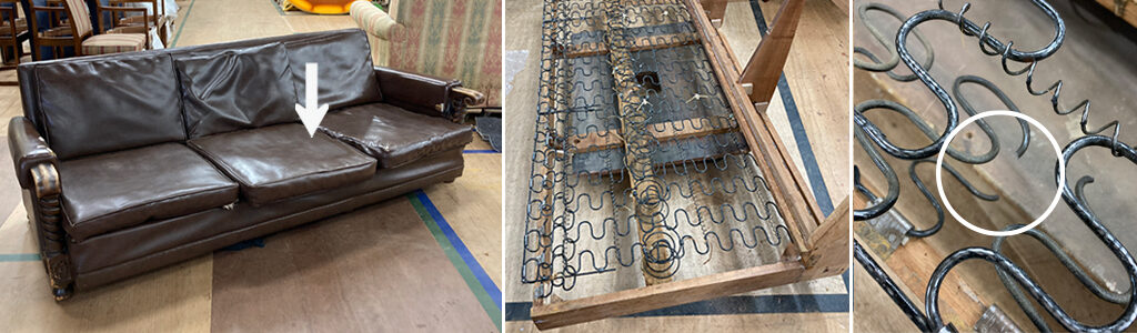 剥がす前から座面のへたりがひどいとは思っていたのですが、開けてみると案の定、スプリングが折れてしまっていました。折れたスプリングは交換します。