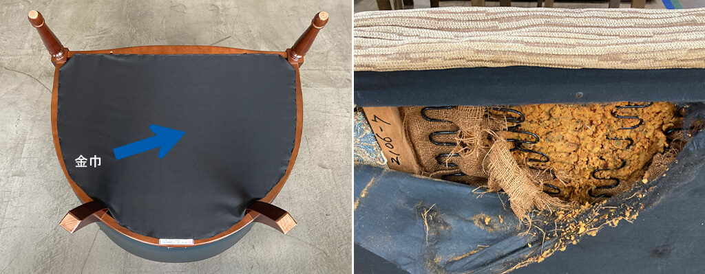 椅子やソファの裏をご覧いただくと、黒い生地が張ってあることがあります。これは金巾(かなきん)と呼ばれる資材です。ウレタン材が古くなるとボロボロになり座った振動でウレタンの粉が落ちてくることがあります。ウレタンの粉などが落ちてこないようにカバーすることが金巾の役割の一つです。今回のお客様の商品もウレタンがボロボロになってしまっていました。