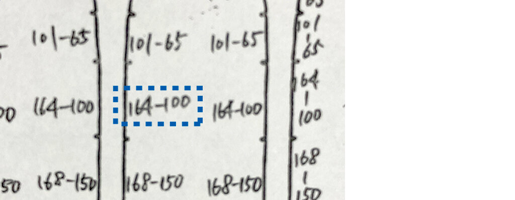 枠で囲った[ 164 - 100 ]という数字ですが、これは何を意味するかというと、生地を164mmの幅のところに切れ込みを入れ、164mmの生地をミシンでシワを寄せて100mmに縮めるという意味です。