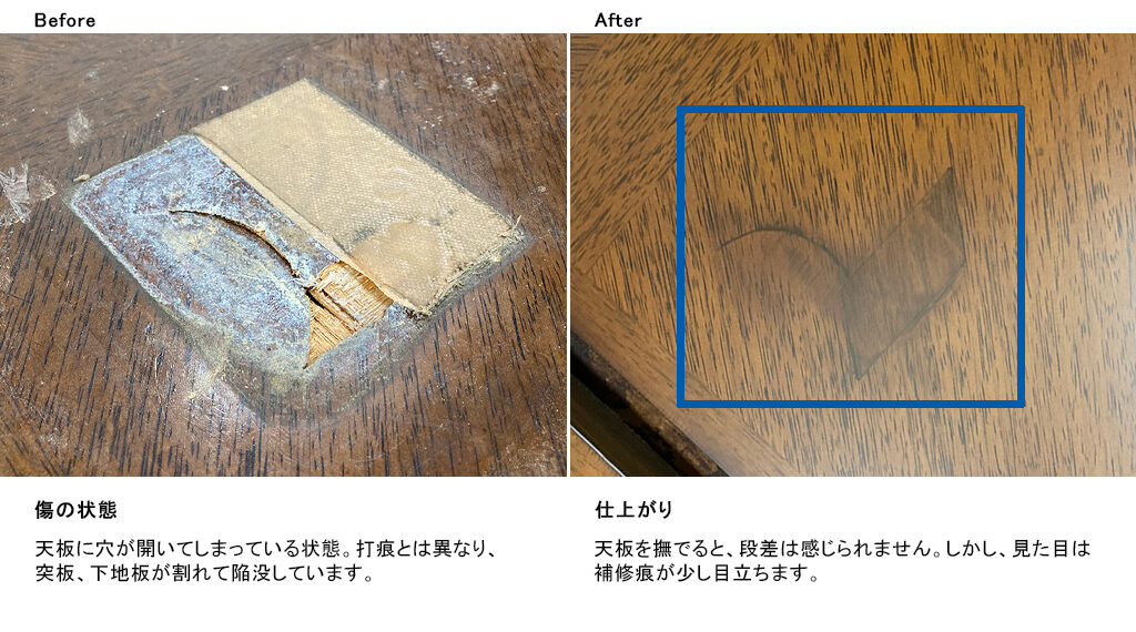 テーブルの状態を拝見し、修理が可能と判断してもどの程度直るのか不安に思われる方もいらっしゃると思います。