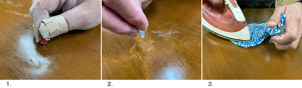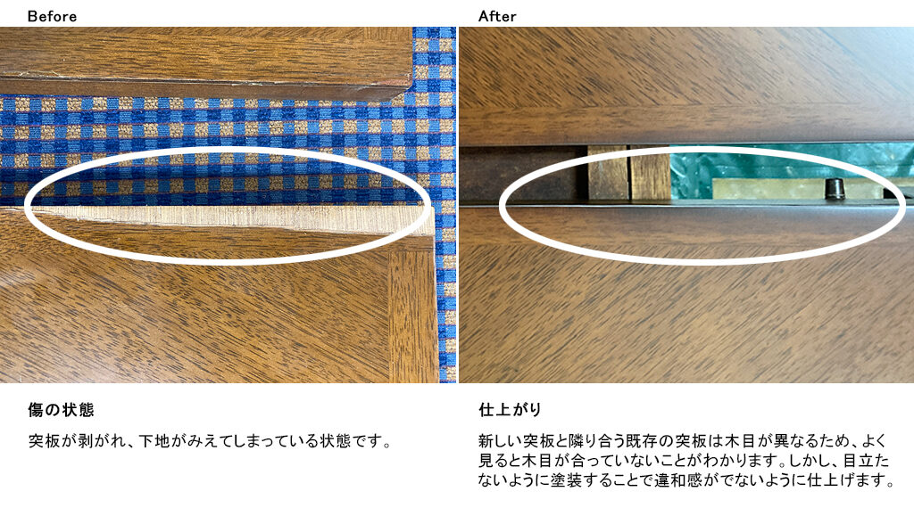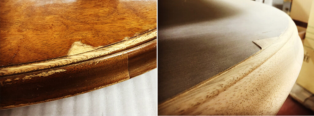詳しい修理方法については【テーブル塗装(前編)突板補修】をご覧ください。