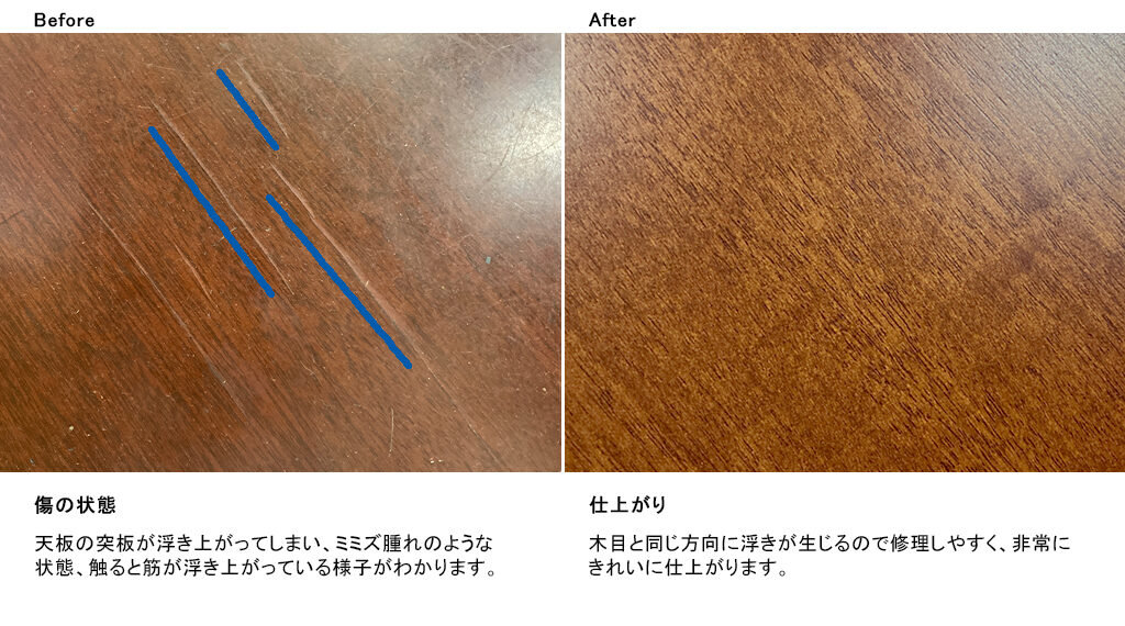 「傷」と一言で言ってもお預かりする天板にはさまざまな傷がついており、その傷の種類によって、直し方が異なり、仕上がりにも違いが生じます。