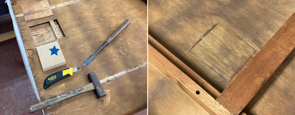 - 突板が剥がれてしまった箇所に、新しい突板を張り付けます。