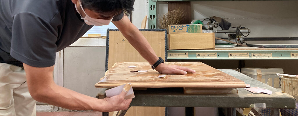 - 新しい突板を張っただけでは凹凸が目立ってしまうため、天板を研磨します。