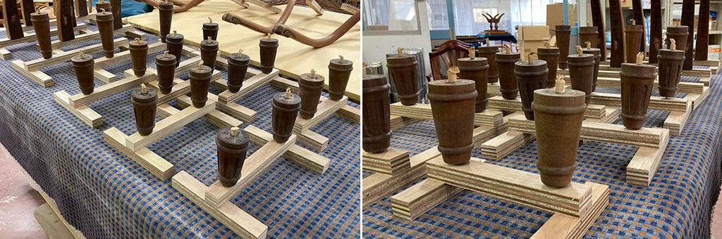 塗装した後のソファの脚部分は平らな面には置けないため、このような台を作成して乾燥させます。この台はこのソファを塗装するために作成したものだそうです。工場では品質や効率を向上するためにはどうすればよいか、考えながらの作業になります。