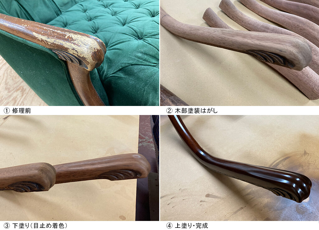 長年お使いいただいたソファはウレタンがヘタってしまい、くたびれてしまっている様子がうかがえます。また木部に関しても塗装が剥がれてしまっていたので、張替えだけではなく木部の塗装修理もご依頼いただきました。