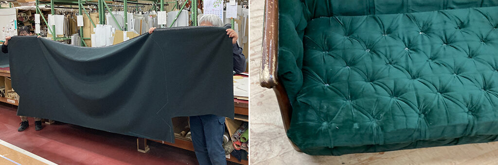 座面はボタンを付ける箇所に合わせて生地を寄せて張っていくため、座面の面積よりも長く生地を取る必要があります。座面の1.5倍くらいの長さになります。