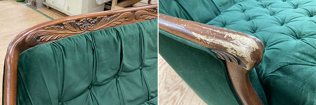 今回修理の依頼をいただきましたルーブルという商品は、彫刻部分がとても特徴的なソファです。