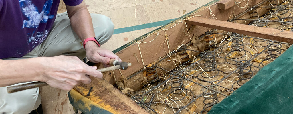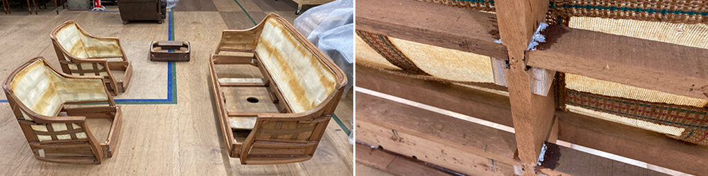 生地を剥がし終わった段階で、フレームにゆがみやゆるみなどがないかチェックします。フレームのゆるみなどは座った時の軋み音につながります。ゆるみがある場合には補強や再接着などを施していきます。生地を張った後では修理することが非常に難しい箇所なので、見落としがないよう細心の注意を払います。