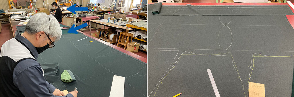 生地の幅が広いので、1人でやると、手前の印をつけた後に作業台の向かいに回って印をつけなければならず、非常に効率が悪くなります。そのため、手前と奥、2人1組で作業をすることが多いそうです。