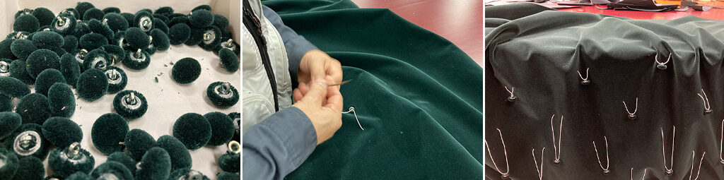 ボタンも同じ張り生地で作る必要があるため、一つ一つ手作業で作っています。