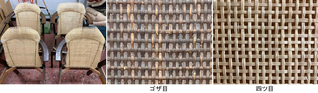 背の籐張り部分は、当時は「ゴザ目」という籐の目が詰まった編み方でしたが、現在はゴザ目が無いため「四ツ目」という編み方のものに変更になります。