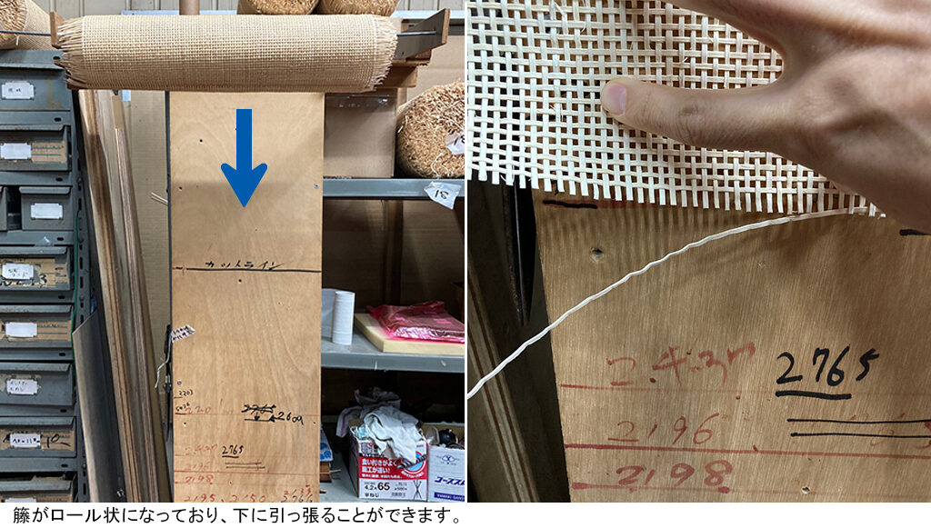 商品の番号を板に記載して籐の先端を引っ張り、その商品番号が記載されたラインに合わせてカットすることで、必要な長さがすぐに測れるというものです。