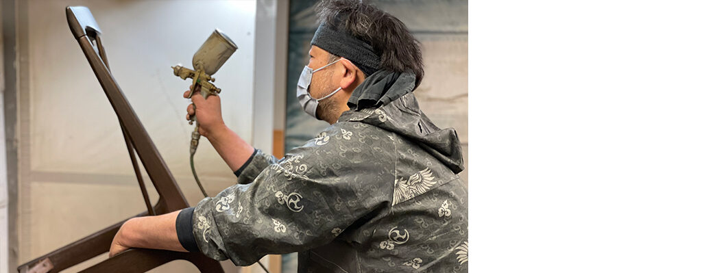 弊社のトラディショナルな家具は、一色で塗装するわけではなく、隅の部分だけ色を濃くするなど、家具に陰影が出るような塗装を施しています。そのため広い面積なのか、細かな部分なのかなど、塗装範囲や箇所に合わせてスプレーガンの種類を変えていきます。