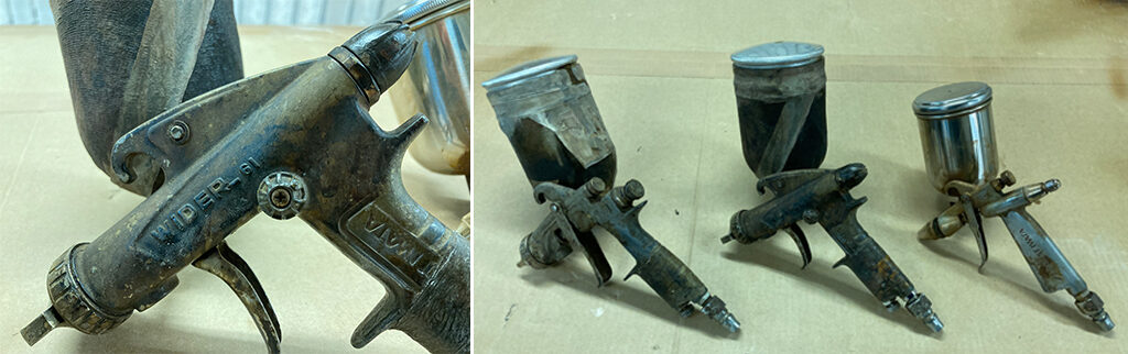 故障をしたら部品交換しながら使用しているそうですが、廃番になってしまう部品もあるそうです。手になじんだスプレーガンですが、いつまで使えるか分からないため丁寧にメンテナンスをしながら使用されていました。