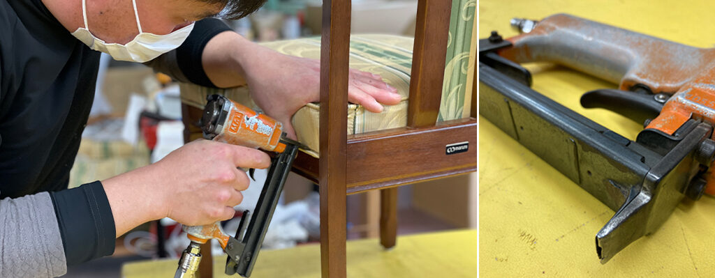 タッカーとは簡単にいうと大きなホチキスのようなもの。レバーを引くと芯が出て、生地と椅子のフレームとをしっかり固定するための道具です。