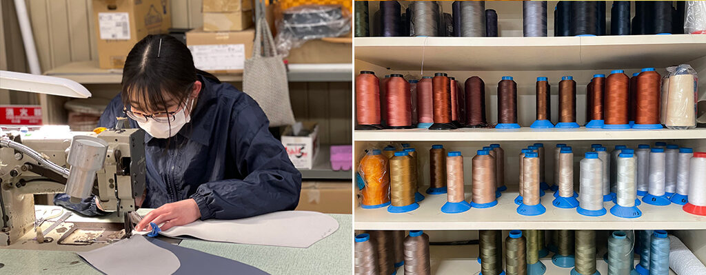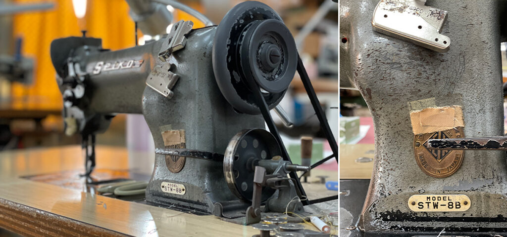 関東の工場では脚踏みミシンを数台使用していますが、それぞれ少しずつ踏み込み具合が異なるため、いつも使用しているミシン以外だとどうしても違和感を感じるそうです。中には自分のミシンを自分以外のスタッフが使うことを嫌がる方もいらっしゃるとのこと。