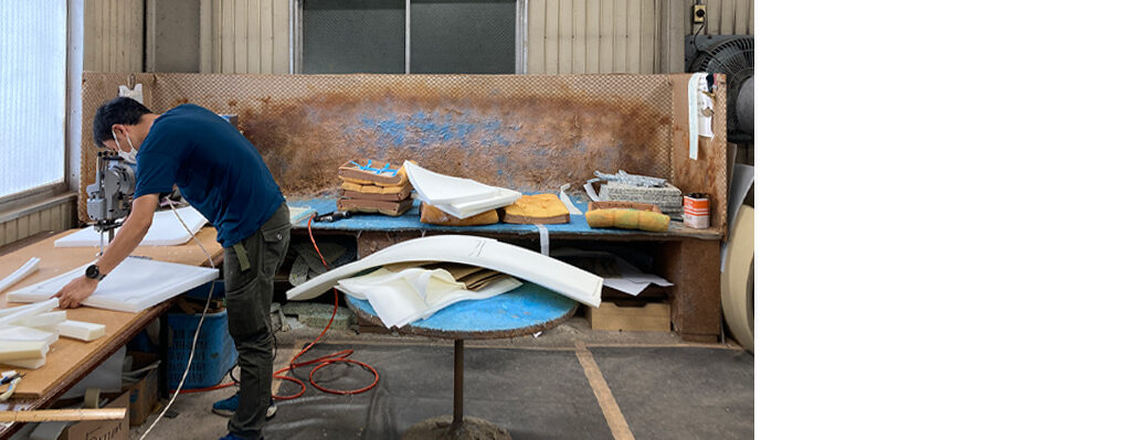 ウレタンをフレームに貼るスペースです。椅子の座り心地を左右する重要な工程です。
