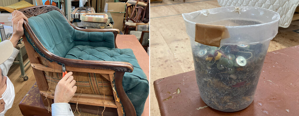 生地はタッカー針というホチキスの芯のようなもので留まっており、1本1本丁寧に取り外していきます。