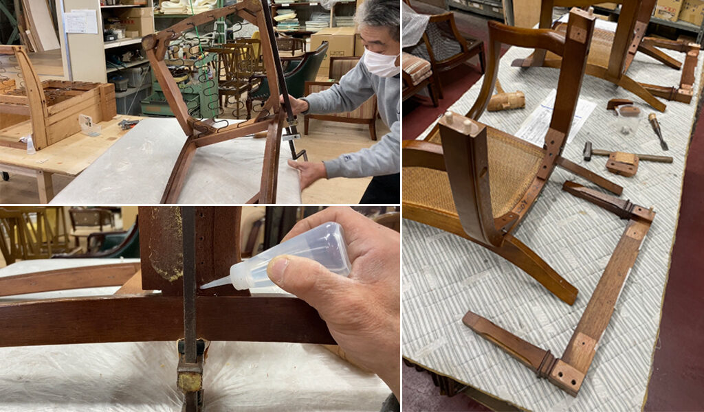 ぐらつきがある場合は木部を修理しますが、ぐらつきの原因は様々なので、いろいろな道具や部材を駆使してぐらつきを直していきます。