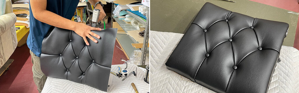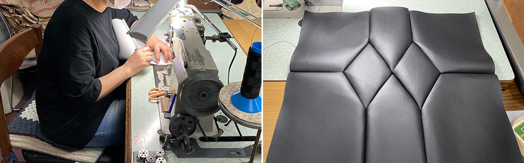 縫い合わせた生地を背もたれ本体に張り込んでいきます。