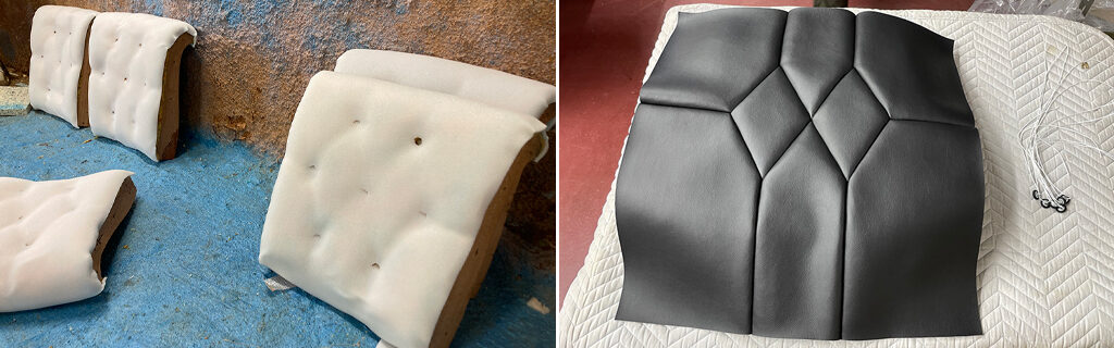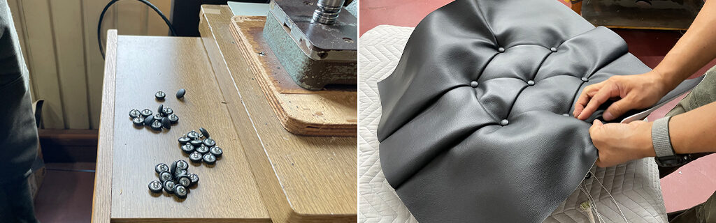 もう一つ特徴的な修理は背もたれの張替えです。この背もたれのデザインを表現するため、1枚の生地ではなく何枚もの生地を張り合わせてこのようなデザインにしています。