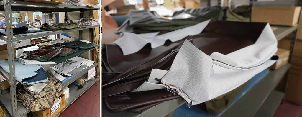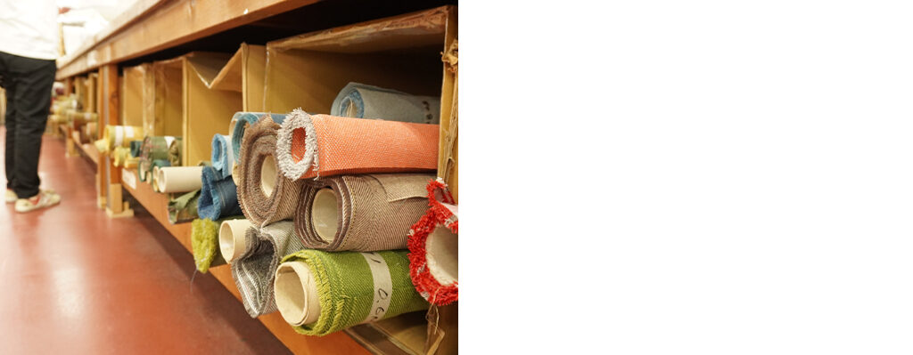 縫製エリアと生地張りエリアの間に置かれた棚。こちらでは生地の受け渡しを行います。縫製が完了したものはこの棚に置かれ、張りチームにバトンタッチします。