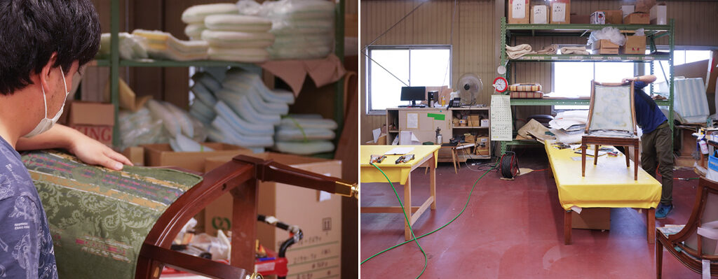 家具の修理工場というと、張替えのみできる工場、塗装のみできる工場と別れているケースが多いのですが、弊社では張りから塗装、木部修理まで一貫して行えるのが強みの一つです。