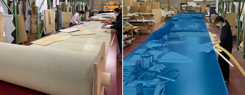 ただ、設計図通りに縫製しても実際に張ってみるときれいに張れないことがあり、その際には縫製チーム、張りチームで打ち合わせ、微調整を行います。