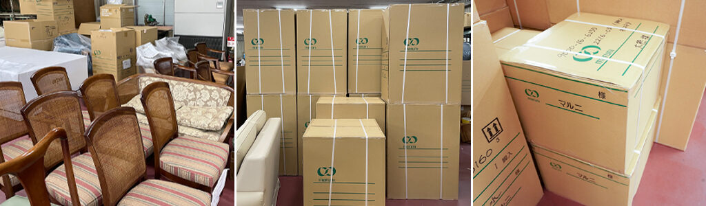 修理品の家具は形状がマチマチです。そのため、きれいに納まらない場合には、梱包用段ボールを加工して梱包します。隙間があると箱の中で家具が暴れ、せっかく修理したものが配送途中で傷がつく恐れがあるため、厳重に梱包します。