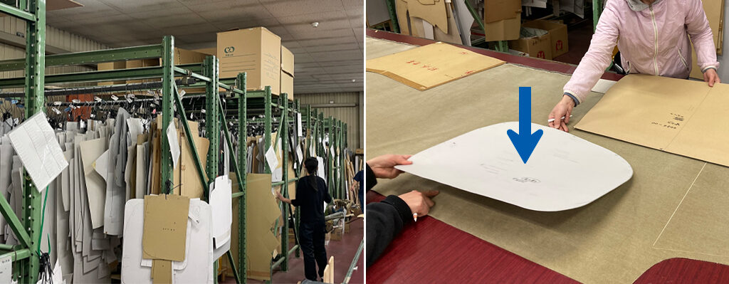 必要な型紙をこの中から探し出します。まれに、型紙通り生地を裁断しても実際の椅子に張ってみると、うまく合わないケースがあります。その際には実際の椅子がきれいに見えるように微調整します。微調整した場合は新たに型紙を作るので、同じ商品でも何種類もの型紙ができ、数がどんどん増えていきます。