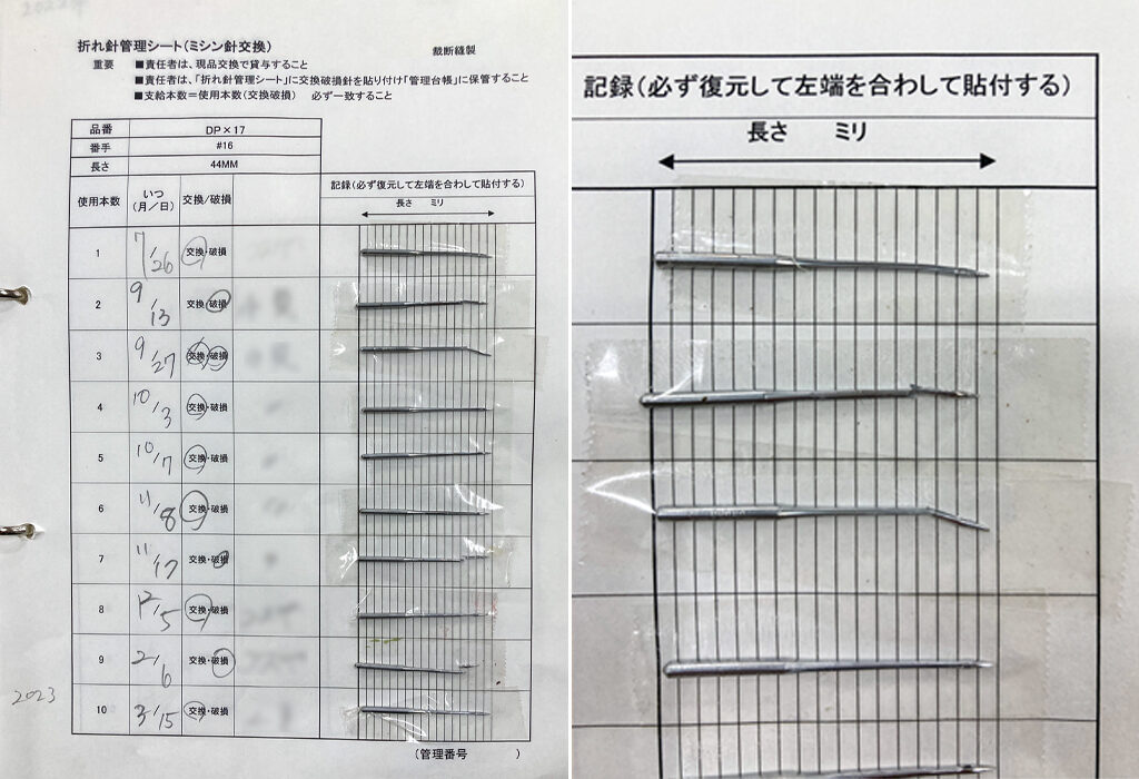 折れた針がお客様の家具に混入しないよう、折れたミシンの針をすべて回収し、台紙に貼り付けて長さを確認します。ここで針の長さが短いようであれば、どこかに破片が落ちている、ということになるので、作業をストップしてその破片が見つかるまで徹底的に探します。