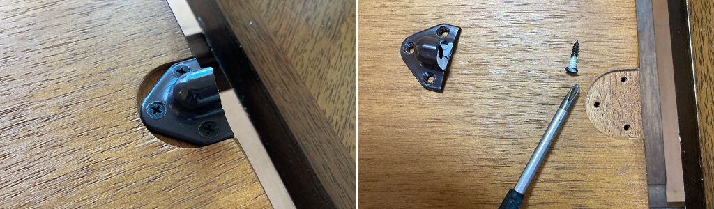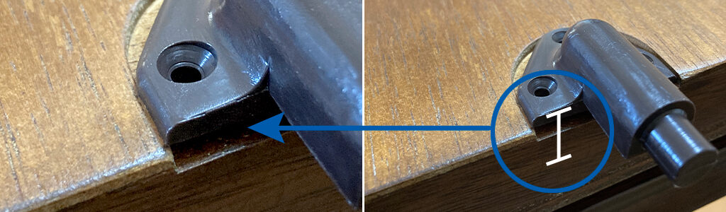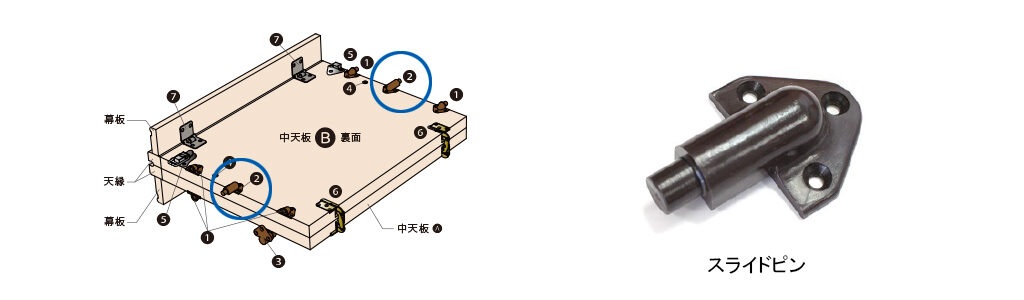 その際、写真の白線のようにスライドピンを取り付ける天板(イラスト内、中天板B)と、パーツの縁が揃うようにしてください。また、木が縮んで新しいスライドピンがくぼみに入らないケースがあります。その際はドライバーの柄などで引っかかっている箇所を軽くたたくと入ることがあります。