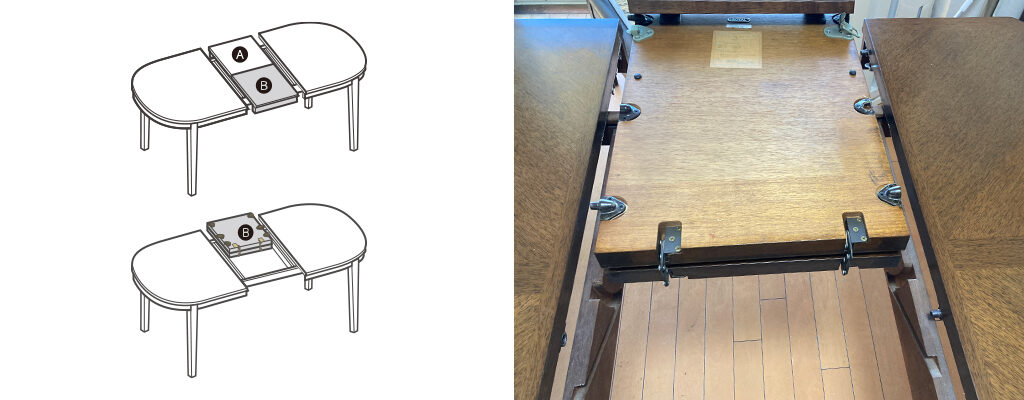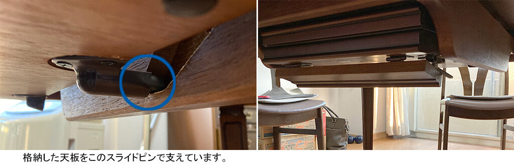 伸長式テーブルを縮めている時、格納した中天板はスライドピンの先端で支えられており、常に負荷がかかります。そのため、普段から伸長式テーブルを縮めた状態でお使いいただいている場合、どうしてもスライドピンの劣化が早まる傾向があります。