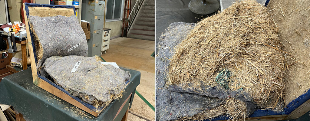 生地を剥がして驚いたのは、クッション材として藁が使用されていたことです。