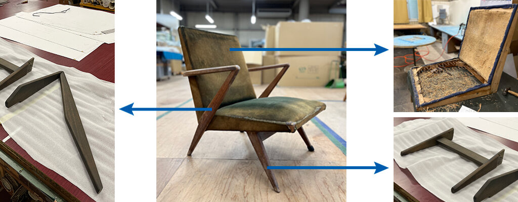 昔の家具は現在使用していない材料、部品などを使用していることもあり、それをどう直すかは工場スタッフの腕の見せ所です。