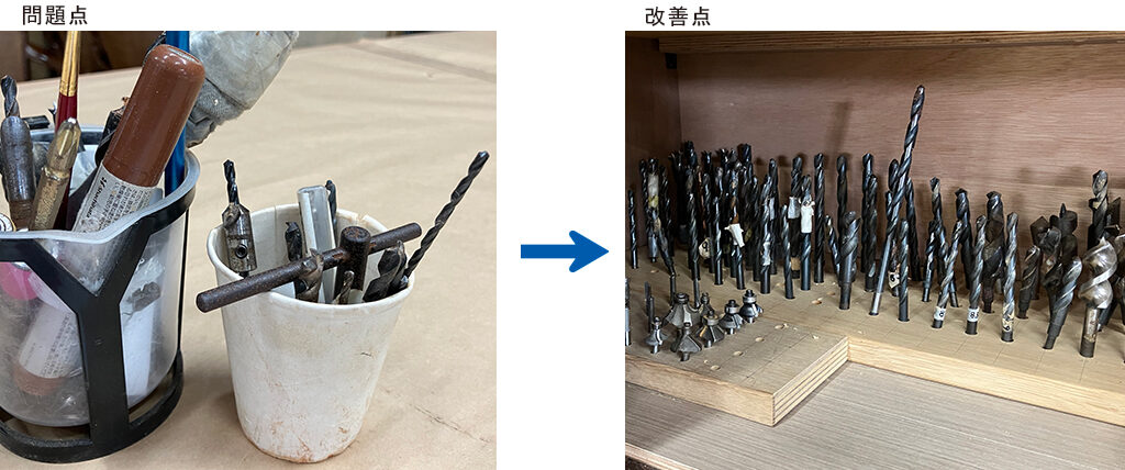 ドリルを立てて収納し、ドリルの種類が一目でわかるようにした。