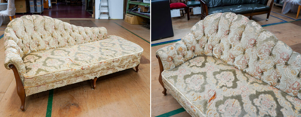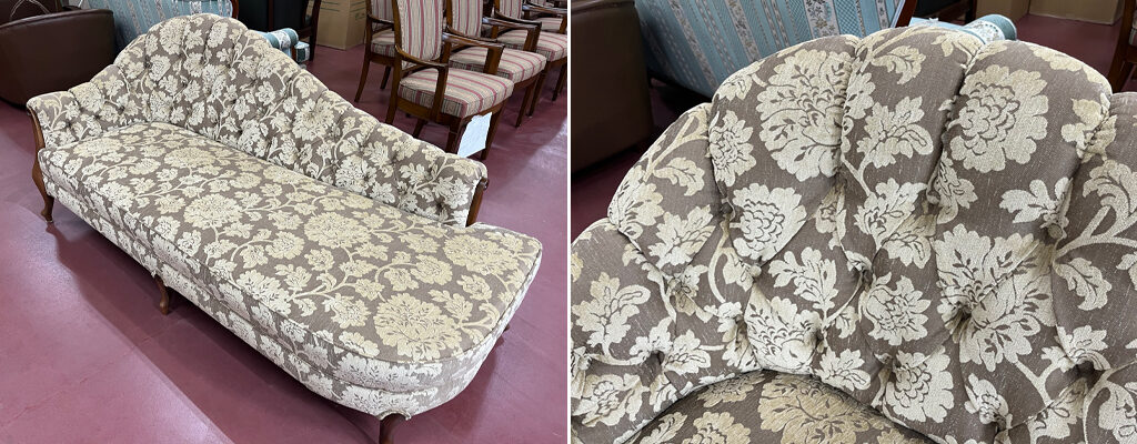 今ではあまり見かけなくなった、左右非対称のアンドリュー カウチソファの張替え依頼がありました。ご実家で使っていたものを直して使用したい、という大変うれしいご相談でした。