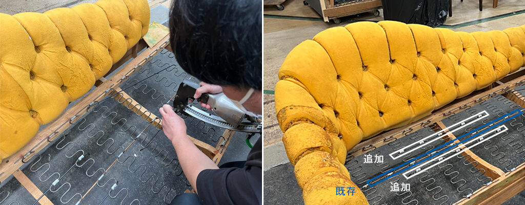 今回のソファもスプリングはまだ使用できる状態でしたが、長年ご利用いただいていたこともあり、新品と比べると多少のダメージを受けていました。そのため、縦方向のSバネを横でつなぐロケーションという部材を追加で取り付けます。こうすることで、新品に近い座り心地に改善されます。