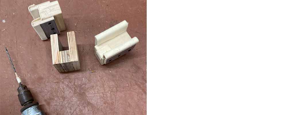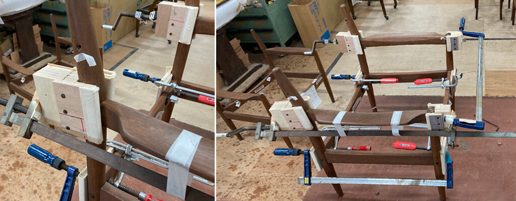 クランプだけで押さえると均等に力がかかりづらかったり、木部に傷がついたりする場合もありますが、自作のパーツを活用することで接着に最適な環境になり、より良い状態で修理ができ、家具もきれいに仕上がります。