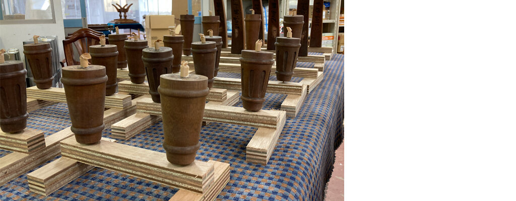 塗料はスプレーガンで吹き付けますが、脚を寝かせたままスプレーすると、塗装がうまくかからない箇所がどうしても出てきます。そこで端材を利用してソファの脚が自立する道具を製作しました。こうすることで、きれいに均等に塗料が吹き付けられます。