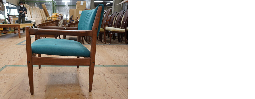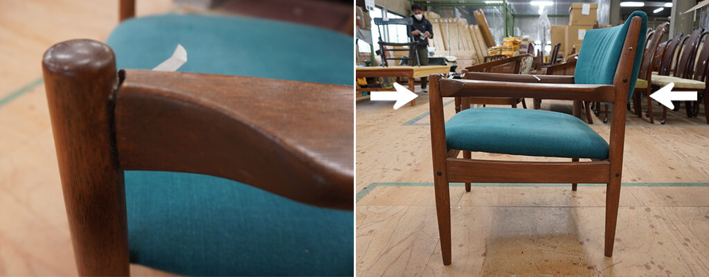 写真の椅子は肘の接合部が外れかけています。 このような場合、肘と脚の接合部に接着剤を注入し、固定します。 接着剤が固まるまで固定が必要ですが、作業スタッフが付きっきりで押さえ続けるわけにもいきません。